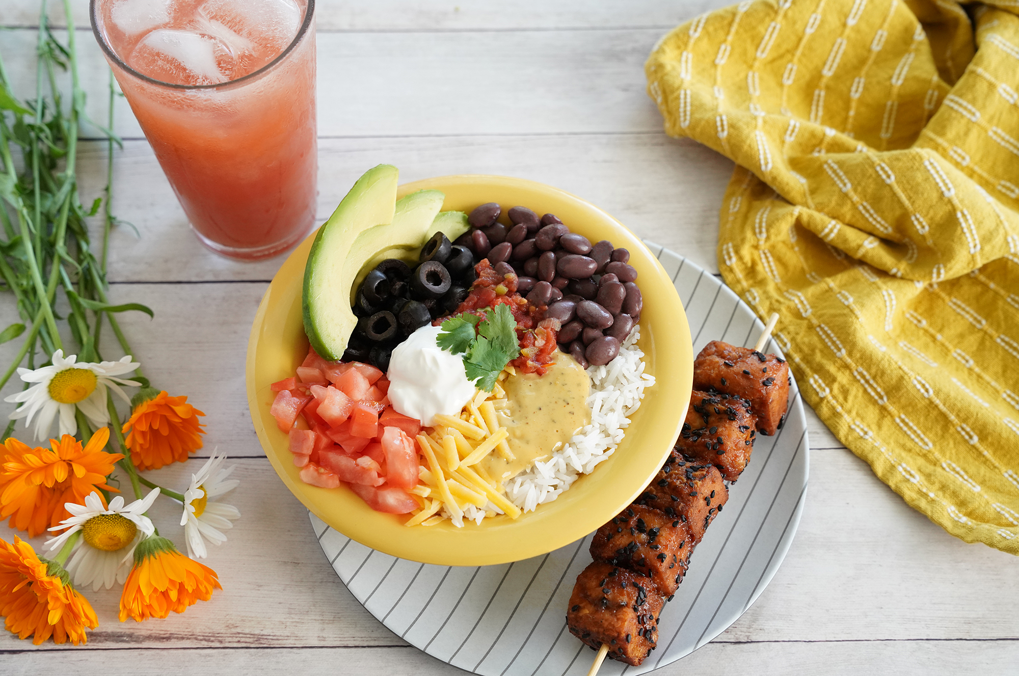 Nourishing meal from Cafe Yumm! including Jazzy bowl with jasmine rice and red beans, BBQ tofu skewer and fresh strawberry lemonade.
