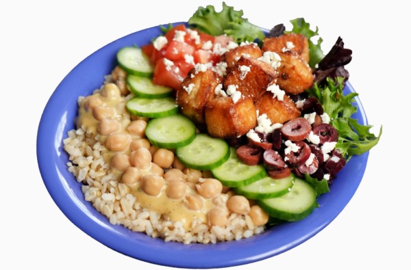 Choose organic baked tofu or all-natural grilled chicken with organic brown rice, organic garbanzo beans, Yumm! Sauce®, Kalamata olives, sliced cucumbers, tomatoes, organic field greens, and feta cheese.