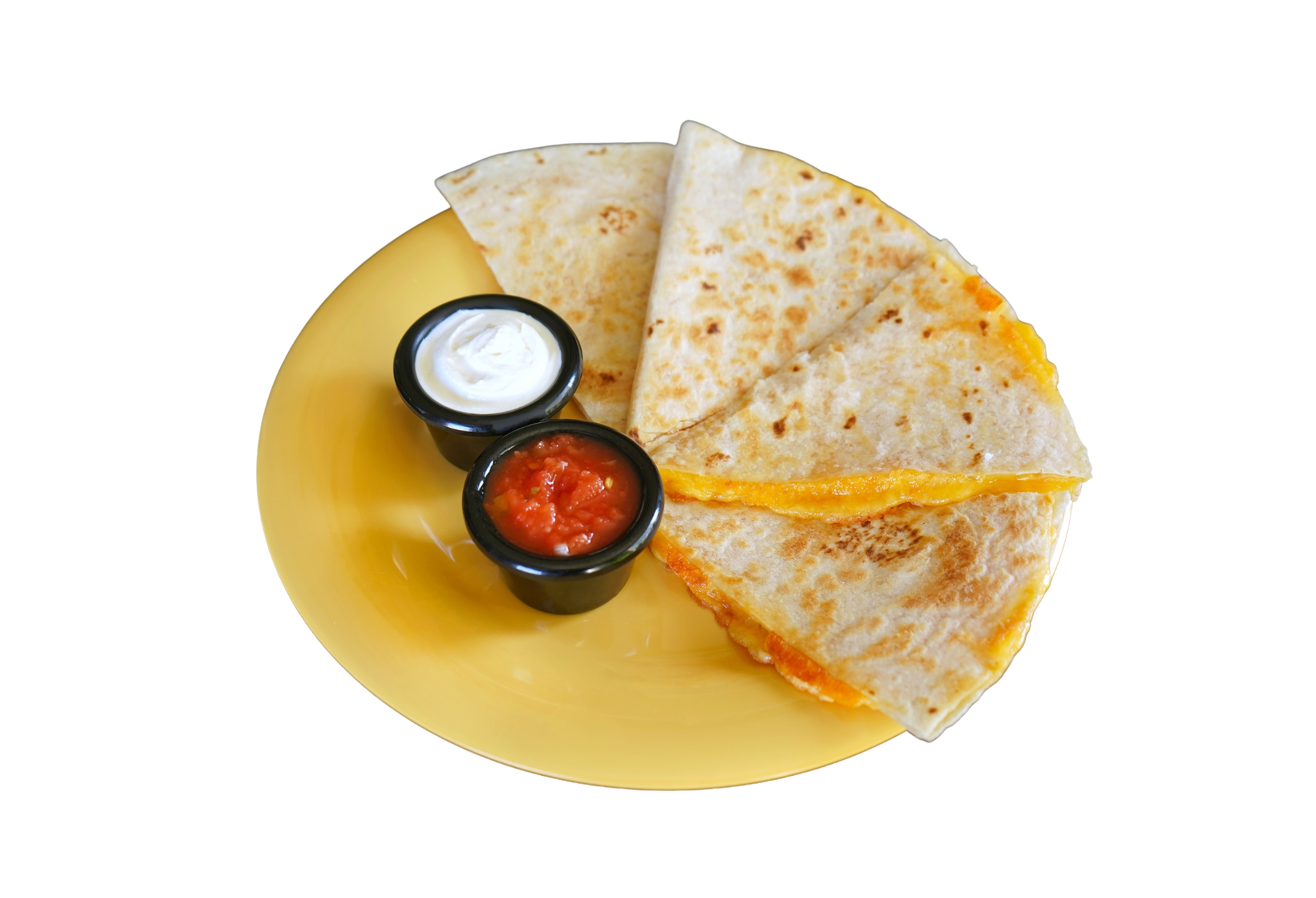 A huge tortilla (white or whole wheat) perfectly grilled with melted cheddar cheese and served with fresh mild red salsa and sour cream on the side.