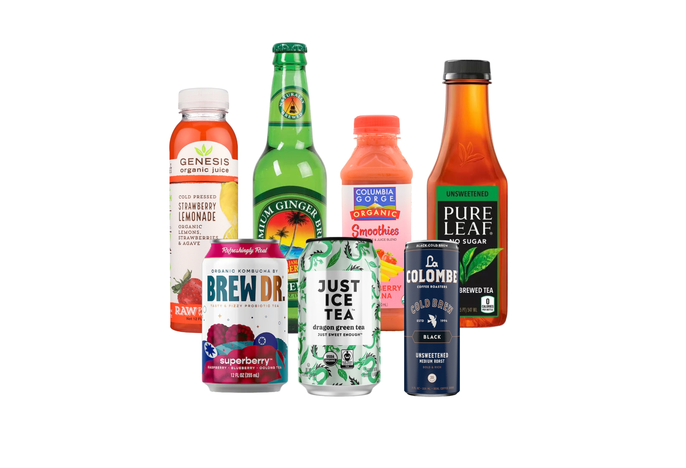 Assorted bottles and cans of Cold Brew Coffee, Iced Tea, Kombucha, Lemonade, Organic Juices, Smoothies, and Sodas