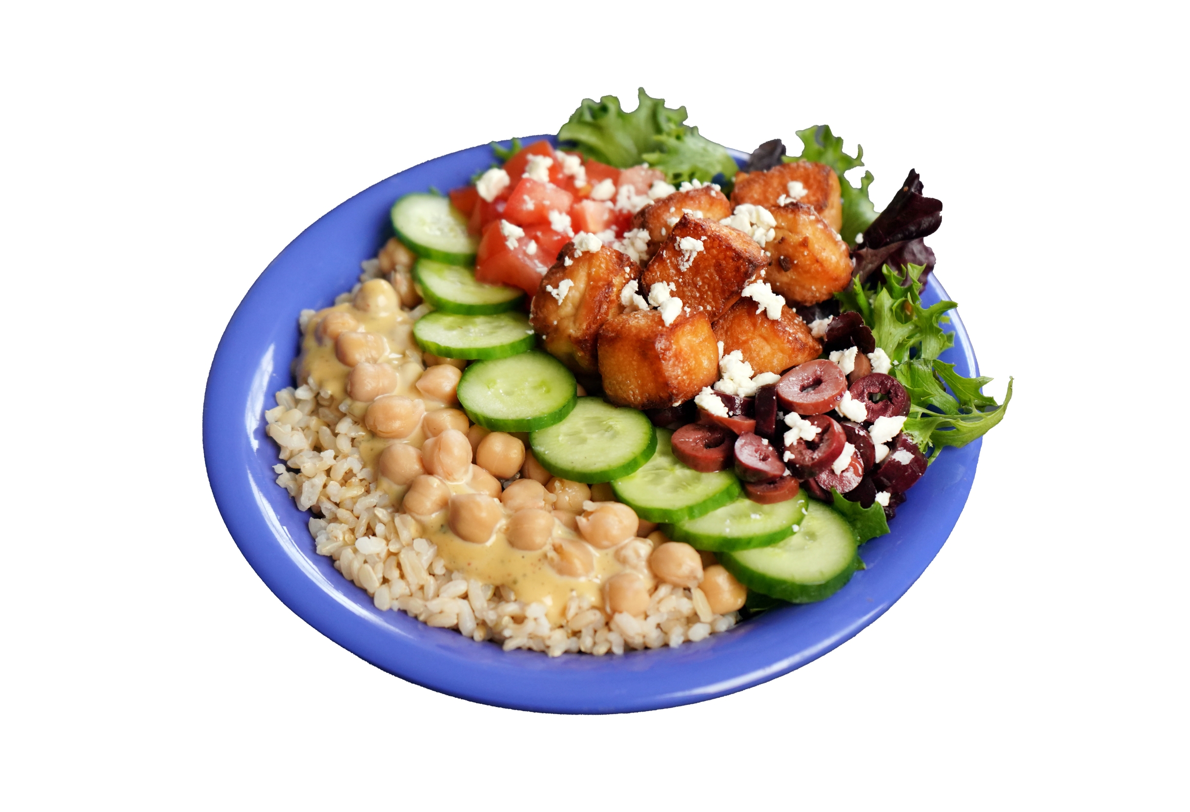 NEW! Choose organic baked tofu or all-natural grilled chicken with organic brown rice, organic garbanzo beans, Yumm! Sauce®, Kalamata olives, sliced cucumbers, tomatoes, organic field greens, and feta cheese.