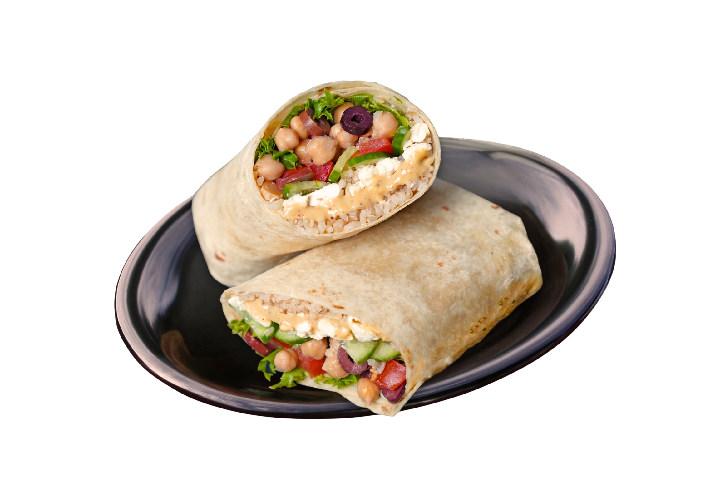 NEW! Choose organic baked tofu or all-natural grilled chicken with organic brown rice, organic garbanzo beans, Yumm! Sauce®, Kalamata olives, sliced cucumbers, tomatoes, organic field greens, and feta cheese wrapped in your choice of a white or whole wheat tortilla.