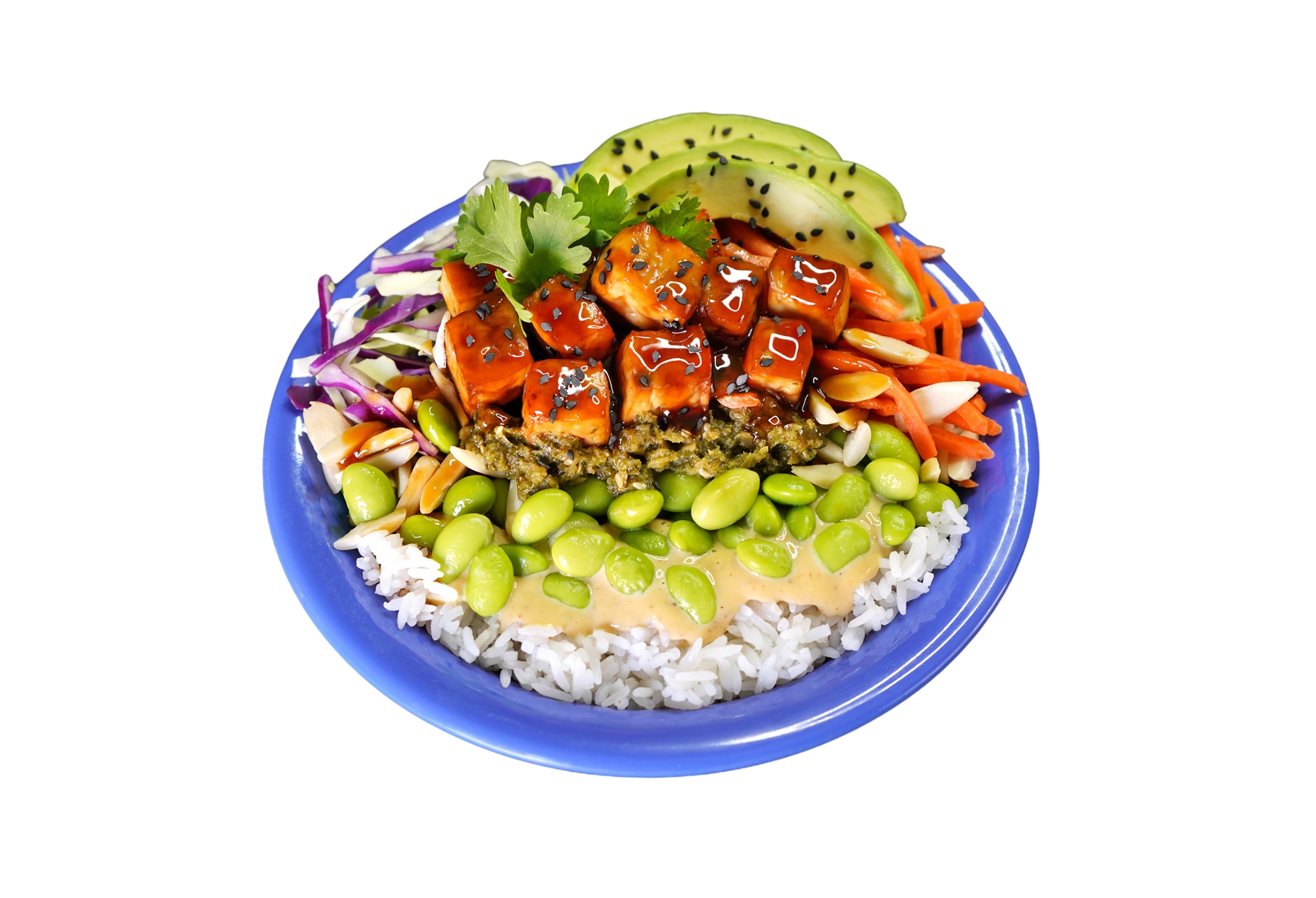Thai Jasmine Rice, Organic Edamame Beans, Yumm! Sauce®, Shredded Carrots and Purple Cabbage Slaw, Jal-Ses® Salsa, Slivered Almonds, Fresh Avocado Slices, Cilantro, and your choice of All-Natural Chicken or Organic Tofu with Teriyaki Sauce, and Black Sesame Seeds.